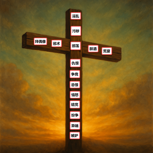 1。淫乱 - 泛指一切违反性道德秩序的行为,包括卖淫、淫乱,一切异教文化中盛行的性罪。被列为“肉体的行为”之首,因为它是人堕落的最明显标志:既破坏身体的圣洁,也象征灵魂对上帝的不忠。凡行此类事的人,不能承受上帝的国。