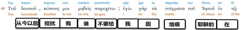 “因为我身上带着耶稣的印记”(《新译本》:因为我身上带着耶稣的烙痕。) - “印记”stigmata,英文 marks,只出现在新约这一次,来自动词