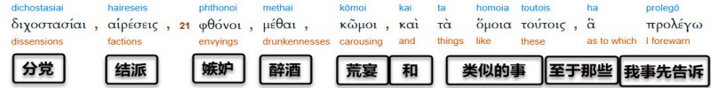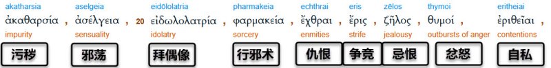 “纷争/分党”dichostasiai,英文 seditions,dissensions, 这个字在新约只出现两次,另一次是在罗十六:17 “弟兄们,那些离间你们、叫你们跌倒、背乎所学之道的人,我劝你们要留意躲避他们。”此字希腊文源自