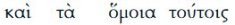 kai ta homoia toutois,英文 and things like these. 表示以上十五项“肉体的行为”的清单不是穷尽所有罪行,而是代表性举例(representative list)罢了。在结构上,这句“以及这些类似的事”与前文加五:19 “情欲的事都是显而易见的,就如。。。”互相呼应。