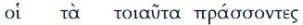 “行这样事的人”hoi ta toiauta prassontes 英文 those such things doing ,这是冠词(hoi) + 分词(prassontes)的结构。