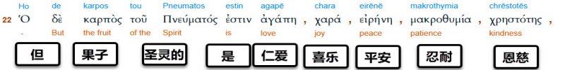 karpos tou Pneumatos,中文直译“果子”“的”“圣灵”- 圣灵的果子。