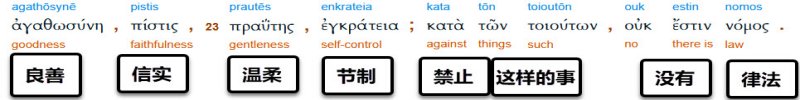 3。加五:22 - 23 “圣灵所结的果子,就是仁爱、喜乐、和平、忍耐、恩慈、良善、信实、23温柔、节制。这样的事,没有律法禁止。”(《新译本》:但圣灵的果子是仁爱、喜乐、平安、忍耐、恩慈、良善、信实、23温柔、节制;这样的事,是没有律法禁止的。)