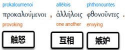 phthoneó,文法是 Present Participle Active, Nominative Masculine Plural,这个动词形式在新约也只出现在这里。在希腊文中是一个非常常见、而且语义稳定的道德词,意思明确:与别人比较,因别人的拥有和蒙福,被肯定,而心生不悦与怨恨。