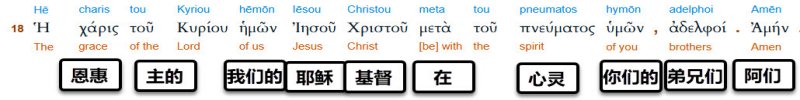 “愿我们主耶稣基督的恩/恩惠与你们的灵同在” - 在保罗的书信里,我们都可以看到类似的祝福语。如罗十六:20 “愿我主耶稣基督的恩常和你们同在!”林前十六:23 “愿主耶稣基督的恩常与你们众人同在!”(帖前五:28 “愿我主耶稣基督的恩常与你们同在。”帖后三:18 “愿我们主耶稣基督的恩常与你们众人同在。”在这恩典的祝福里包含了三个元素:一、主格(nominative)的“恩典”一词,强调上帝在“我们的主耶稣”里与他的受造者交往的基本性质(就是恩典)!