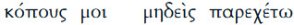 原文 mēdeis (no one)是第三人称不定代词(indefinite pronoun),意思是“没有人 / 任何人”,语法上属于主格单数(nominative singular)。保罗没有以第二人称说“你们不要再搅扰我”,而是用第三人称说“不要有人再搅扰我”。由于下半节的“我”