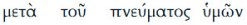 meta tou pneumatos hymōn,英文 with the spirit of you。直译应该是“与你们的灵同在”。